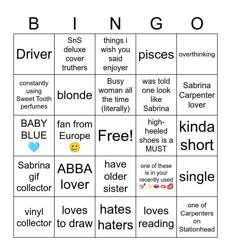 This bingo card has a free space and 24 words: ABBA lover, loves to draw, Busy woman all the time (literally), vinyl collector, overthinking, Driver, constantly using Sweet Tooth perfumes, SnS deluxe cover truthers, high-heeled shoes is a MUST, have older sister, was told one look like Sabrina, BABY BLUE π©΅, one of these is in your recently used π π»β¨ππ«¦π, single, blonde, loves reading, kinda short, things i wish you said enjoyer, Sabrina Carpenter lover, fan from Europe π₯², one of Carpenters on Stationhead, Sabrina gif collector, pisces and hates haters.