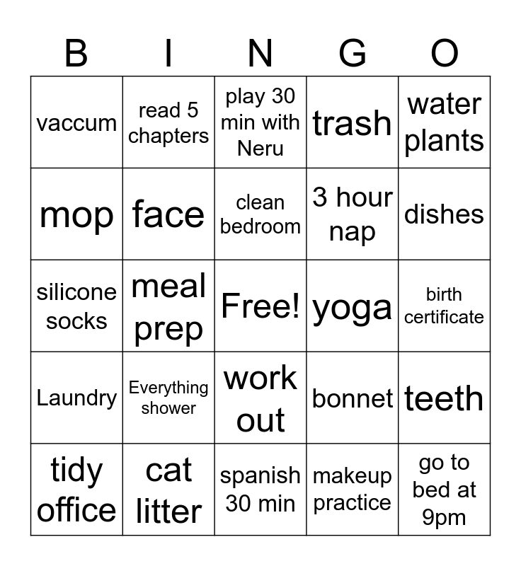 This bingo card has a free space and 24 words: Everything shower, cat litter, clean bedroom, tidy office, water plants, vaccum, mop, read 5 chapters, yoga, work out, 3 hour nap, silicone socks, bonnet, teeth, face, makeup practice, birth certificate, play 30 min with Neru, dishes, meal prep, go to bed at 9pm, Laundry, trash and spanish 30 min.