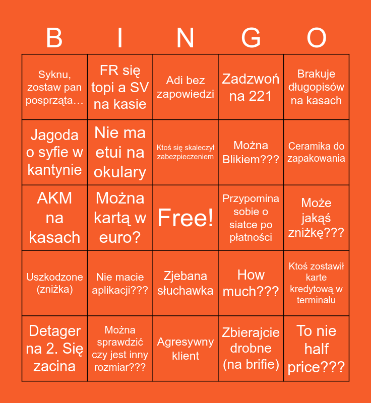 This bingo card has a free space and 29 words: Tax free???, Można sprawdzić czy jest inny rozmiar???, Adi bez zapowiedzi, 20:59 ktoś z XX reklamacji, Brakuje długopisów na kasach, Syknu, zostaw pan posprząta…, Nie ma etui na okulary, Ktoś się skaleczył zabezpieczeniem, Przypomina sobie o siatce po płatności, Ktoś zostawił karte kredytową w terminalu, Detager na 2. Się zacina, Można kartą w euro?, Zbierajcie drobne (na brifie), To nie half price???, AKM na kasach, Patryk na butach, Agresywny klient, How much???, Ceramika do zapakowania, Uszkodzone (zniżka), Nie macie aplikacji???, Ktoś pomoże z dywanem, Można Blikiem???, Może jakąś zniżkę???, Jagoda o syfie w kantynie, FR się topi a SV na kasie, Zjebana słuchawka, Zadzwoń na 221 and (Nie) dyskretna kontrola.
