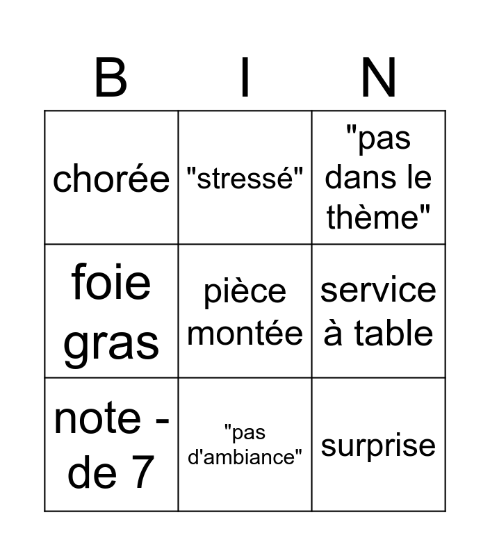 This bingo card has a free space and 8 words: service à table, "pas dans le thème", "stressé", note - de 7, chorée, surprise, foie gras and "pas d'ambiance".