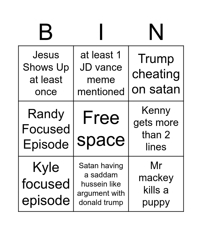 This bingo card has a free space and 8 words: Kenny gets more than 2 lines, Trump cheating on satan, at least 1 JD vance meme mentioned, Kyle focused episode, Jesus Shows Up at least once, Mr mackey kills a puppy, Randy Focused Episode and Satan having a saddam hussein like argument with donald trump.