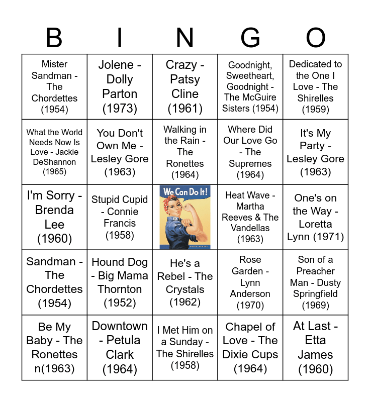This bingo card has 1 images, a free space and 43 words: At Last - Etta James (1960), Baby Love - The Supremes (1964), Be My Baby - The Ronettes n(1963), Both Sides Now - Joni Mitchell (1966), Chapel of Love - The Dixie Cups (1964), Crazy - Patsy Cline (1961), Da Doo Ron Ron - The Crystals (1961), Dedicated to the One I Love - The Shirelles (1959), Downtown - Petula Clark (1964), Goodnight, Sweetheart, Goodnight - The McGuire Sisters (1954), Heat Wave - Martha Reeves & The Vandellas (1963), He's a Rebel - The Crystals (1962), Hound Dog - Big Mama Thornton (1952), I fall to pieces - Patsy Cline (1961), I Met Him on a Sunday - The Shirelles (1958), I Will Follow Him - Little Peggy March (1963), I'm Sorry - Brenda Lee (1960), It Wasn't God Who Made Honky Tonk Angels - Kitty Wells (1952), It's My Party - Lesley Gore (1963), Jolene - Dolly Parton (1973), Leader of the Pack - The Shangri Las (1965), Lipstick on Your Collar - Connie Francis (1959), Mister Sandman - The Chordettes (1954), My Boyfriend's Back - The Angels (1963), One's on the Way - Loretta Lynn (1971), Que Sera, Sera (Whatever Will Be, Will Be) - Doris Day (1956), Respect - Aretha Franklin (1967), Rose Garden - Lynn Anderson (1970), Sandman - The Chordettes (1954), Sincerely - The McGuire Sisters (1954), Son of a Preacher Man - Dusty Springfield (1969), Stand By Your Man - Tammy Wynette (1968), Stop! In the Name of Love - The Supremes (1965), Stupid Cupid - Connie Francis (1958), The Loco-Motion - Little Eva (1962), The Night They Drove Old Dixie Down - Joan Baez (1971), Then He Kissed Me - The Crystals (1963), Walking in the Rain - The Ronettes (1964), What the World Needs Now Is Love - Jackie DeShannon (1965), Where Did Our Love Go - The Supremes (1964), Will You Still Love Me Tomorrow - The Shirelles (1960), You Don't Own Me - Lesley Gore (1963) and Your Good Girl's Gonna Go Bad - Tammy Wynette (1967).