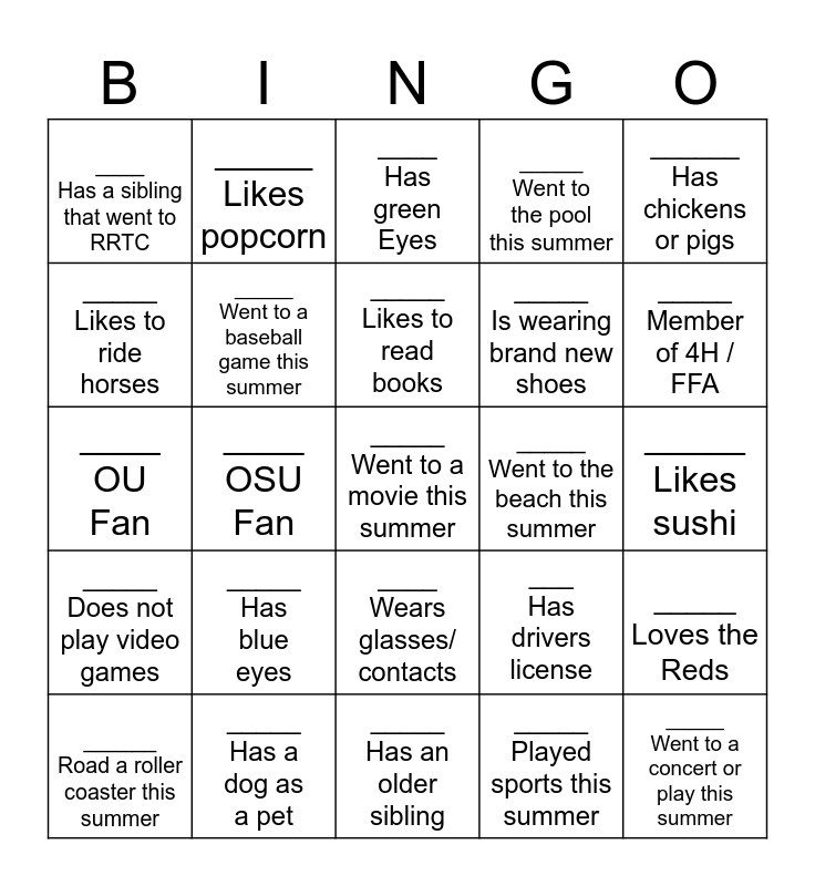 This bingo card has 25 words: _____ Has blue eyes, _____ Has an older sibling, _____ Likes to read books, ______ Road a roller coaster this summer, ______ Has chickens or pigs, ____ Has a sibling that went to RRTC, _____ Likes to ride horses, _____ Likes popcorn, _____ Went to the beach this summer, ____ Wears glasses/ contacts, _____ Is wearing brand new shoes, ____ OU Fan, ___ Has drivers license, _____ Loves the Reds, _____ Went to a baseball game this summer, _____ Went to a concert or play this summer, _____ Likes sushi, ____ Has green Eyes, _____ Member of 4H / FFA, ____ OSU Fan, _____ Went to a movie this summer, _____ Has a dog as a pet, _____ Does not play video games, _____ Went to the pool this summer and _____ Played sports this summer.