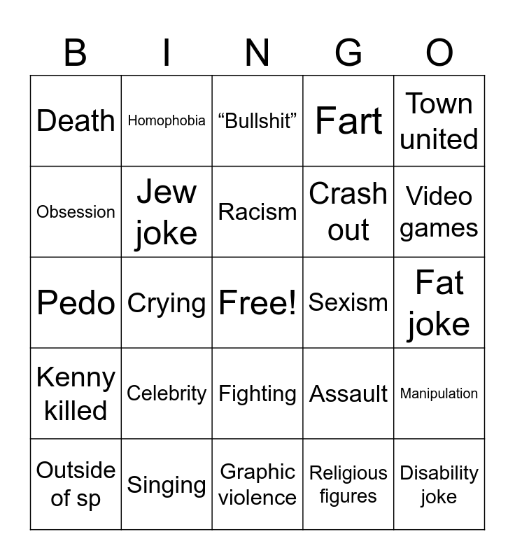 This bingo card has a free space and 24 words: Celebrity, Singing, Racism, Outside of sp, Town united, Death, Obsession, Homophobia, Sexism, Fighting, Crash out, Pedo, Assault, Manipulation, Jew joke, Religious figures, Fat joke, “Bullshit”, Video games, Crying, Disability joke, Kenny killed, Fart and Graphic violence.