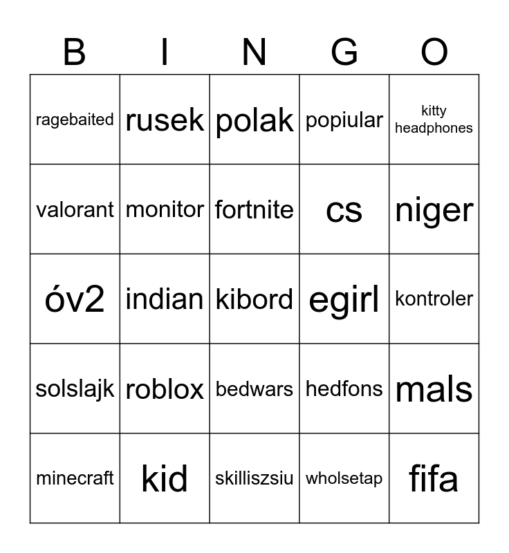 This bingo card has a free space and 24 words: roblox, kid, fortnite, minecraft, kitty headphones, ragebaited, valorant, rusek, egirl, bedwars, cs, óv2, hedfons, mals, monitor, wholsetap, kontroler, polak, niger, indian, fifa, solslajk, popiular and skilliszsiu.