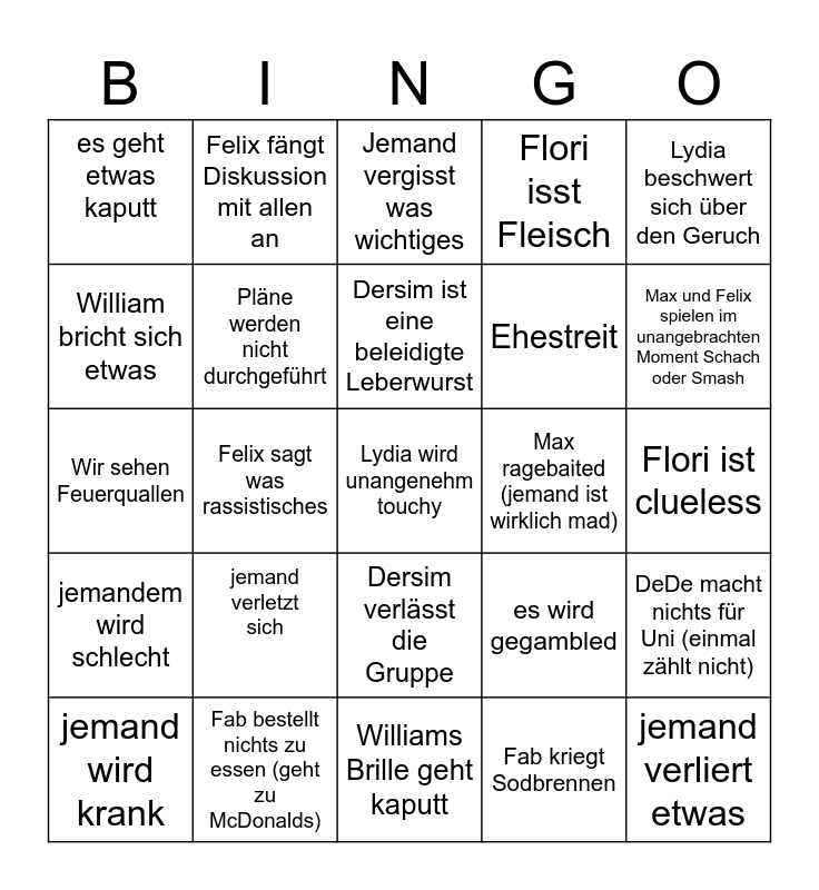 This bingo card has a free space and 24 words: jemand verletzt sich, Fab bestellt nichts zu essen (geht zu McDonalds), Dersim ist eine beleidigte Leberwurst, jemand wird krank, Lydia beschwert sich über den Geruch, es geht etwas kaputt, William bricht sich etwas, Felix fängt Diskussion mit allen an, Max ragebaited (jemand ist wirklich mad), Dersim verlässt die Gruppe, Ehestreit, Wir sehen Feuerquallen, es wird gegambled, DeDe macht nichts für Uni (einmal zählt nicht), Pläne werden nicht durchgeführt, Fab kriegt Sodbrennen, Flori ist clueless, Jemand vergisst was wichtiges, Max und Felix spielen im unangebrachten Moment Schach oder Smash, Felix sagt was rassistisches, jemand verliert etwas, jemandem wird schlecht, Flori isst Fleisch and Williams Brille geht kaputt.