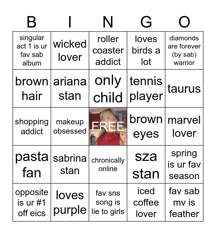 This bingo card has a free space and 24 words: sabrina stan, loves purple, only child, opposite is ur #1 off eics, diamonds are forever (by sab) warrior, singular act 1 is ur fav sab album, brown hair, wicked lover, brown eyes, chronically online, tennis player, shopping addict, sza stan, spring is ur fav season, ariana stan, iced coffee lover, marvel lover, roller coaster addict, taurus, makeup obsessed, fav sab mv is feather, pasta fan, loves birds a lot and fav sns song is lie to girls.