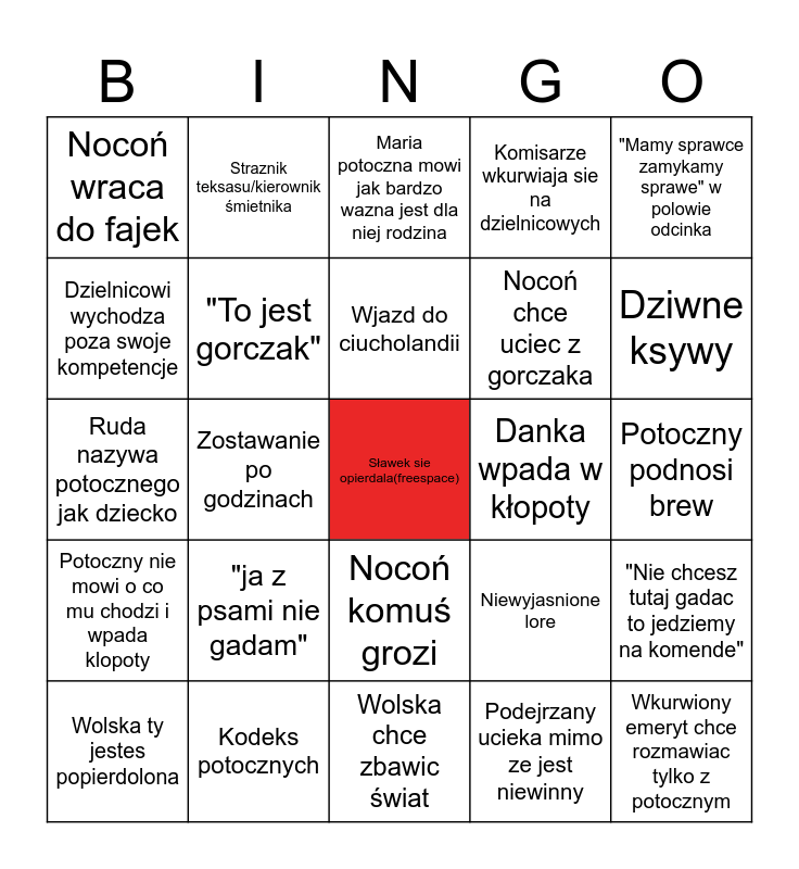 This bingo card has a free space and 24 words: "ja z psami nie gadam", Kodeks potocznych, Wjazd do ciucholandii, Wolska ty jestes popierdolona, "Mamy sprawce zamykamy sprawe" w polowie odcinka, Nocoń wraca do fajek, Dzielnicowi wychodza poza swoje kompetencje, Straznik teksasu/kierownik śmietnika, Danka wpada w kłopoty, Nocoń komuś grozi, Nocoń chce uciec z gorczaka, Ruda nazywa potocznego jak dziecko, Niewyjasnione lore, "Nie chcesz tutaj gadac to jedziemy na komende", "To jest gorczak", Podejrzany ucieka mimo ze jest niewinny, Potoczny podnosi brew, Maria potoczna mowi jak bardzo wazna jest dla niej rodzina, Dziwne ksywy, Zostawanie po godzinach, Wkurwiony emeryt chce rozmawiac tylko z potocznym, Potoczny nie mowi o co mu chodzi i wpada klopoty, Komisarze wkurwiaja sie na dzielnicowych and Wolska chce zbawic świat.