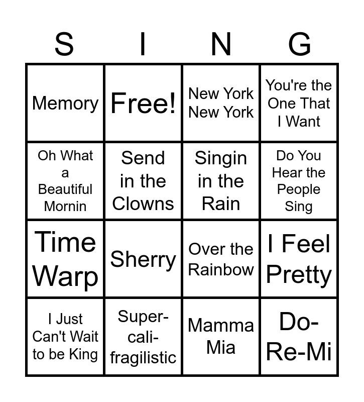 This bingo card has 19 words: Over the Rainbow, I Could Have Danced All Night, New York New York, Do-Re-Mi, I Feel Pretty, Oh What a Beautiful Mornin, Mamma Mia, Memory, Free!, Time Warp, Sherry, Send in the Clowns, Singin in the Rain, Super-cali-fragilistic, I Just Can't Wait to be King, Match-maker, You're the One That I Want, Do You Hear the People Sing and All That Jazz.