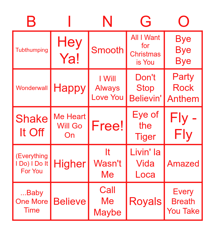 This bingo card has a free space and 55 words: All About That Bass, ...Baby One More Time, Crazy, Tubthumping, Call Me Maybe, All Star, Happy, Sweet Caroline, Don't Stop Believin', Uptown Funk, All I Want for Christmas is You, Crazy In Love, Poker Face, Whenever, Wherever, Wannabe, Someone Like You, Bye Bye Bye, Me Heart Will Go On, Mr. Brightside, Every Breath You Take, Eye of the Tiger, Who Let The Dogs Out, Livin' la Vida Loca, Smooth, Two Princes, I Will Always Love You, Royals, We Are Young, Fly - Fly, Amazed, Mambo No. 5, Somebody That I Used To Know, MMMBop, Hotel California, Wonderwall, Shake It Off, Lose Yourself, (Everything I Do) I Do It For You, Everybody Wants To Rule The World, Californication, Hey Ya!, Livin' On A Prayer, I Don't Want to Miss a Thing, Yeah!, Higher, Believe, Thunder, Despacito, Closing Time, Party Rock Anthem, In Da Club, I Swear, Never Gonna Give You Up, It Wasn't Me and Photograph.