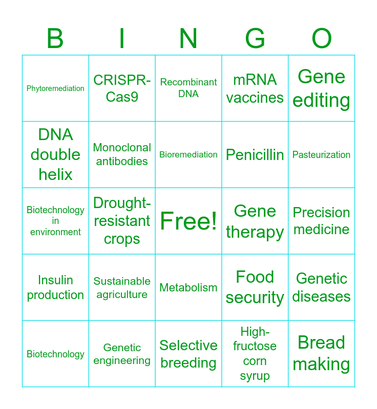 This bingo card has a free space and 51 words: Fermentation, Fermentation tank, Agricultural Revolution, Genetic engineering, Gene therapy, Human insulin, Recombinant DNA, GMOs (Genetically Modified Organisms), CRISPR-Cas9, Biofuels, Phytoremediation, Bioremediation, Precision medicine, Drought-resistant crops, Yeast, Bacteria, Selective breeding, Pasteurization, Antibiotics, Penicillin, DNA double helix, Human Genome Project, Gene editing, Monoclonal antibodies, Golden Rice, Biotechnology, Metabolism, Genetic modification, Sustainable agriculture, mRNA vaccines, Plant-based meats, Cultured meat, Pollutants, Environmental biotechnology, Rapid diagnostic tests, Insulin production, Biotechnology products, Bread making, Yogurt production, Biotechnology impact on health, Biotechnology in environment, Biotechnology in agriculture, Biotechnology in food preservation, Enzymes in food processing, High-fructose corn syrup, Recombinant bacterium, Gene function research, Genetic diseases, Crop yields, Food security and Biotechnology sustainability.