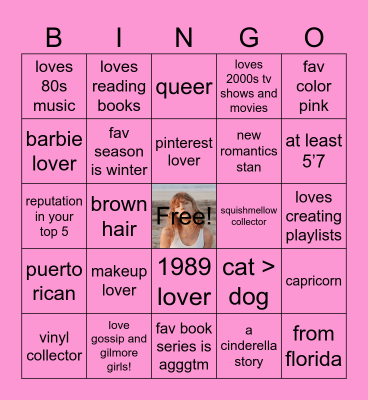 This bingo card has a free space and 24 words: makeup lover, love gossip and gilmore girls!, pinterest lover, vinyl collector, fav color pink, loves 80s music, barbie lover, loves reading books, squishmellow collector, 1989 lover, new romantics stan, reputation in your top 5, cat > dog, capricorn, fav season is winter, a cinderella story, loves creating playlists, queer, at least 5’7, brown hair, from florida, puerto rican, loves 2000s tv shows and movies and fav book series is agggtm.