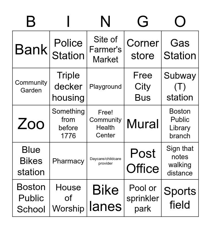 This bingo card has a free space and 24 words: Pharmacy, House of Worship, Playground, Boston Public School, Gas Station, Bank, Community Garden, Police Station, Mural, Daycare/childcare provider, Free City Bus, Zoo, Post Office, Sign that notes walking distance, Triple decker housing, Pool or sprinkler park, Boston Public Library branch, Site of Farmer's Market, Subway (T) station, Something from before 1776, Sports field, Blue Bikes station, Corner store and Bike lanes.