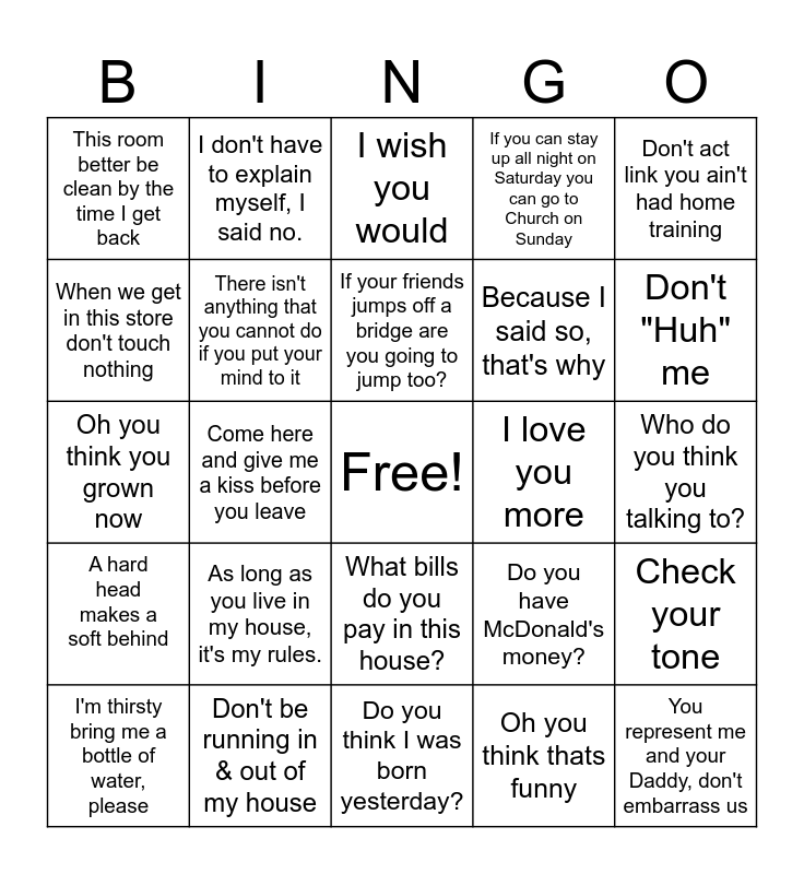 This bingo card has a free space and 35 words: Close that refrigerator door, Go find your Daddy, Stop that crying before I give you something to cry about, There isn't anything that you cannot do if you put your mind to it, What bills do you pay in this house?, If you can stay up all night on Saturday you can go to Church on Sunday, When we get in this store don't touch nothing, No Today, If your friends jumps off a bridge are you going to jump too?, Did you drink the last cold soda I had in the fridge?, Oh you think you grown now, Don't act link you ain't had home training, Get out of my purse, I hope you know that school work like you know them songs, This room better be clean by the time I get back, I love you more, Oh you think thats funny, Come here and give me a kiss before you leave, A hard head makes a soft behind, You represent me and your Daddy, don't embarrass us, Do you have McDonald's money?, I'm thirsty bring me a bottle of water, please, Check your tone, Don't be running in & out of my house, I wish you would, Don't "Huh" me, Money don't grow on trees, Don't make me get my belt, Because I said so, that's why, Who do you think you talking to?, I don't care who started it, YOU stop it., Do you think I was born yesterday?, As long as you live in my house, it's my rules., I don't have to explain myself, I said no. and Fix your face before I fix it for you!.