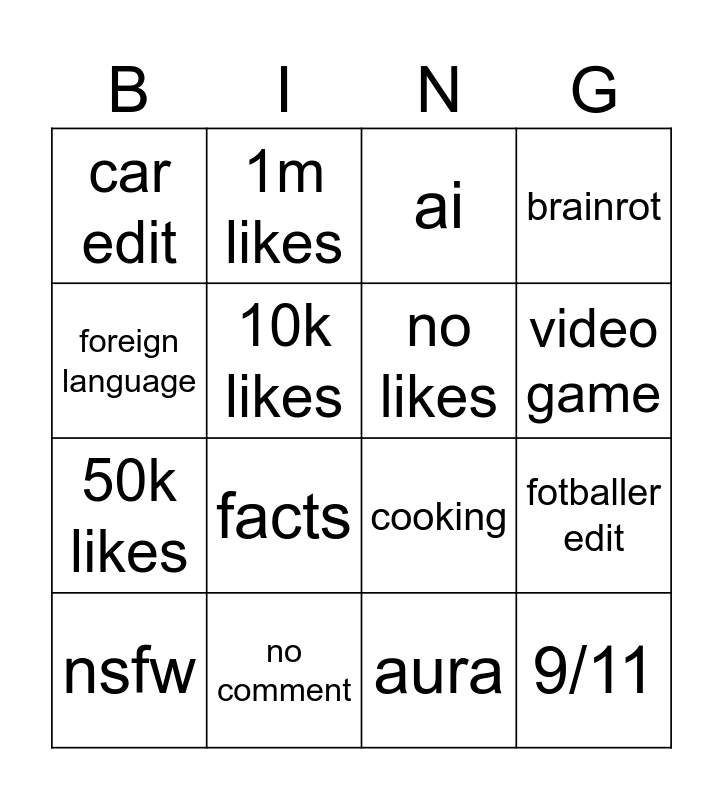This bingo card has 17 words: aura, nsfw, ai, car edit, facts, brainrot, fotballer edit, no likes, video game, 10k likes, no comment, cooking, foreign language, 1m likes, 50k likes, racist and 9/11.