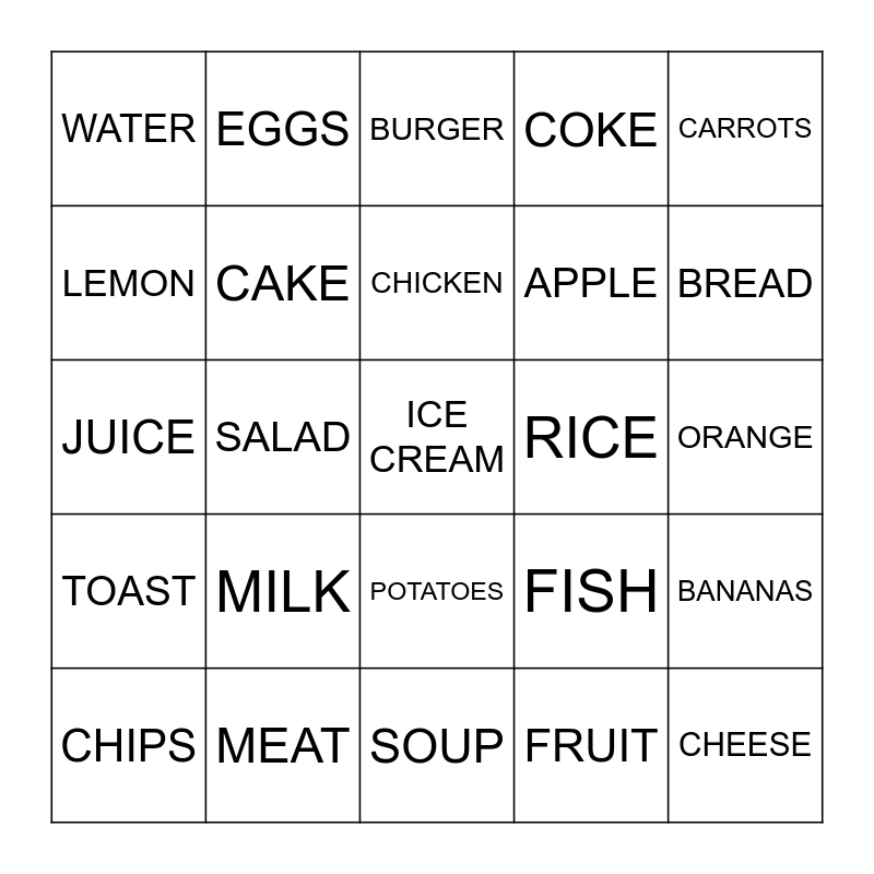 This bingo card has a free space and 24 words: MILK, MEAT, CHICKEN, CHIPS, CARROTS, WATER, LEMON, EGGS, RICE, POTATOES, APPLE, JUICE, FISH, BANANAS, CAKE, FRUIT, ORANGE, BURGER, BREAD, SALAD, CHEESE, TOAST, COKE and SOUP.