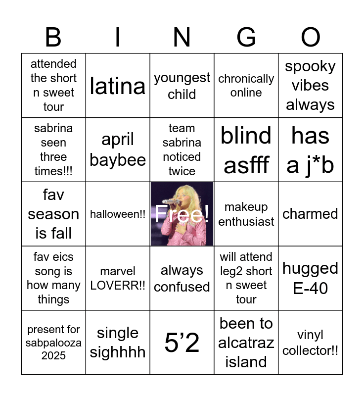 This bingo card has a free space and 24 words: marvel LOVERR!!, single sighhhh, team sabrina noticed twice, present for sabpalooza 2025, spooky vibes always, attended the short n sweet tour, sabrina seen three times!!!, latina, makeup enthusiast, always confused, blind asfff, fav season is fall, will attend leg2 short n sweet tour, hugged E-40, april baybee, been to alcatraz island, charmed, youngest child, has a j*b, halloween!!, vinyl collector!!, fav eics song is how many things, chronically online and 5’2.
