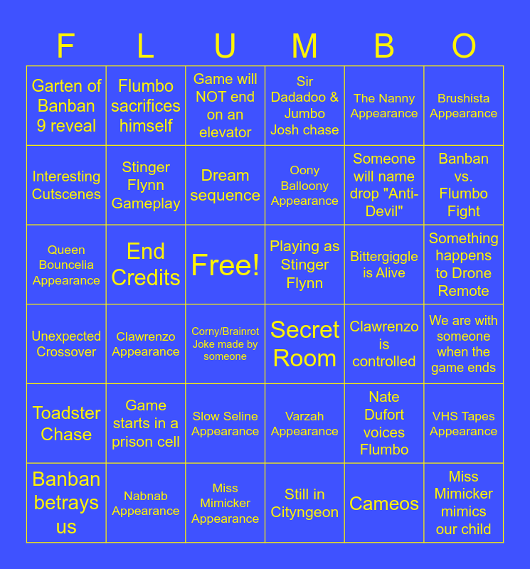 This bingo card has 36 words: Varzah Appearance, Slow Seline Appearance, Still in Cityngeon, Interesting Cutscenes, Unexpected Crossover, Playing as Stinger Flynn, Stinger Flynn Gameplay, Miss Mimicker Appearance, The Nanny Appearance, Nate Dufort voices Flumbo, Banban vs. Flumbo Fight, Sir Dadadoo & Jumbo Josh chase, VHS Tapes Appearance, End Credits, Oony Balloony Appearance, Garten of Banban 9 reveal, Toadster Chase, Bittergiggle is Alive, Queen Bouncelia Appearance, Game will NOT end on an elevator, Free!, Clawrenzo Appearance, Secret Room, Corny/Brainrot Joke made by someone, Clawrenzo is controlled, Flumbo sacrifices himself, Someone will name drop "Anti-Devil", Nabnab Appearance, Dream sequence, Brushista Appearance, Miss Mimicker mimics our child, Banban betrays us, We are with someone when the game ends, Something happens to Drone Remote, Game starts in a prison cell and Cameos.