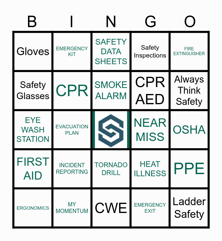 This bingo card has a free space and 32 words: EMERGENCY EXIT, FIRE DRILL, EVACUATION PLAN, SHELTER-IN-PLACE, FIRST AID, CPR, FIRE EXTINGUISHER, PPE, EMERGENCY KIT, LOCKOUT/ TAGOUT, SMOKE ALARM, SAFETY DATA SHEETS, STEEL TOE SHOES, TRIP HAZARD, NEAR MISS, HAZWOPER, ERGONOMICS, EYE WASH STATION, TORNADO DRILL, INCIDENT REPORTING, HEAT ILLNESS, EYE PROTECTION, OSHA, MY MOMENTUM, Ladder Safety, Safety Inspections, CPR AED, Safety Glasses, Gloves, CWE, Safety Record and Always Think Safety.
