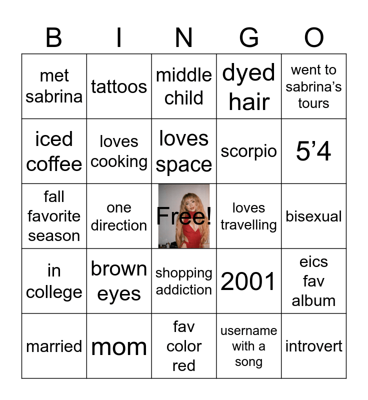 This bingo card has a free space and 24 words: brown eyes, mom, loves space, married, went to sabrina’s tours, met sabrina, iced coffee, tattoos, loves travelling, shopping addiction, scorpio, fall favorite season, 2001, eics fav album, loves cooking, username with a song, bisexual, middle child, 5’4, one direction, introvert, in college, dyed hair and fav color red.