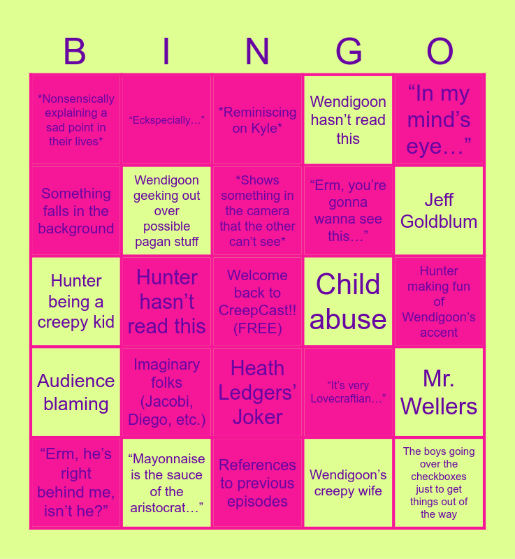 This bingo card has a free space and 24 words: “Erm, he’s right behind me, isn’t he?”, Imaginary folks (Jacobi, Diego, etc.), *Shows something in the camera that the other can’t see*, Wendigoon’s creepy wife, “In my mind’s eye…”, *Nonsensically explaining a sad point in their lives*, “Eckspecially…”, *Reminiscing on Kyle*, Child abuse, Hunter making fun of Wendigoon’s accent, Hunter being a creepy kid, Wendigoon geeking out over possible pagan stuff, “It’s very Lovecraftian…”, Mr. Wellers, Something falls in the background, “Mayonnaise is the sauce of the aristocrat…”, References to previous episodes, Wendigoon hasn’t read this, Jeff Goldblum, Audience blaming, Hunter hasn’t read this, Heath Ledgers’ Joker, “Erm, you’re gonna wanna see this…” and The boys going over the checkboxes just to get things out of the way.