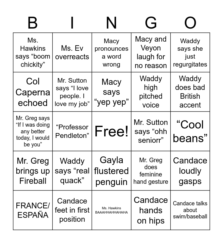 This bingo card has a free space and 24 words: Waddy says “real quack”, Candace feet in first position, Macy says “yep yep”, FRANCE/ ESPAÑA, Waddy says she just regurgitates, Ms. Hawkins says “boom chickity”, Col Caperna echoed, Ms. Ev overreacts, Mr. Sutton says “ohh seniorr”, Gayla flustered penguin, Waddy high pitched voice, Mr. Greg says “If I was doing any better today, I would be you”, Mr. Greg does feminine hand gesture, Candace loudly gasps, Mr. Sutton says “I love people. I love my job”, Candace hands on hips, “Cool beans”, Macy pronounces a word wrong, Waddy does bad British accent, “Professor Pendleton”, Candace talks about swim/baseball, Mr. Greg brings up Fireball, Macy and Veyon laugh for no reason and Ms. Hawkins BAAAHHAHHAHAHA.