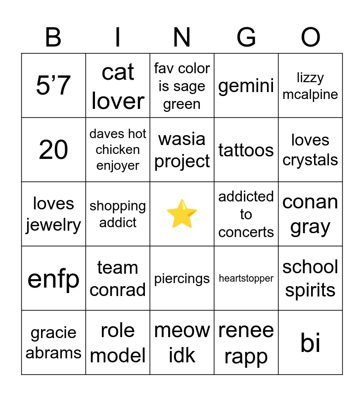 This bingo card has a free space and 24 words: team conrad, role model, wasia project, gracie abrams, lizzy mcalpine, 5’7, 20, cat lover, addicted to concerts, piercings, tattoos, loves jewelry, heartstopper, school spirits, daves hot chicken enjoyer, renee rapp, conan gray, fav color is sage green, loves crystals, shopping addict, bi, enfp, gemini and meow idk.
