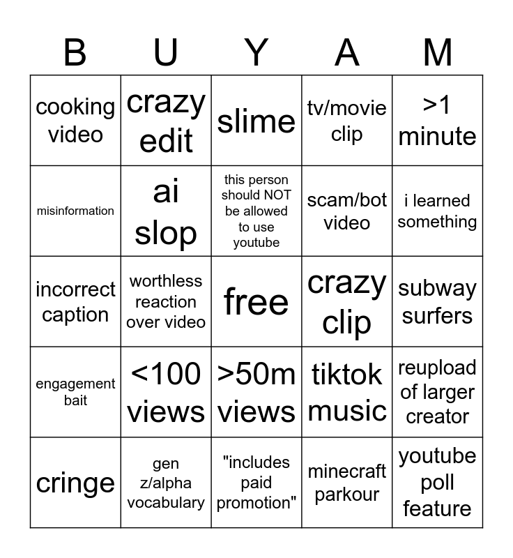 This bingo card has a free space and 24 words: <100 views, gen z/alpha vocabulary, this person should NOT be allowed to use youtube, cringe, >1 minute, cooking video, misinformation, crazy edit, crazy clip, >50m views, scam/bot video, incorrect caption, tiktok music, reupload of larger creator, ai slop, minecraft parkour, subway surfers, slime, i learned something, worthless reaction over video, youtube poll feature, engagement bait, tv/movie clip and "includes paid promotion".