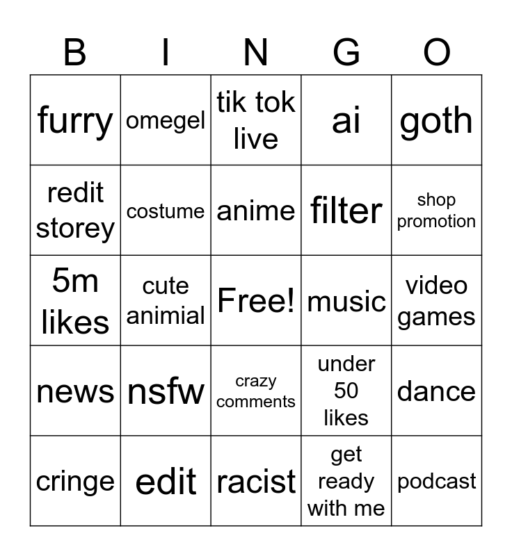 This bingo card has a free space and 24 words: nsfw, edit, anime, cringe, goth, furry, redit storey, omegel, music, crazy comments, filter, 5m likes, under 50 likes, dance, costume, get ready with me, video games, tik tok live, shop promotion, cute animial, podcast, news, ai and racist.