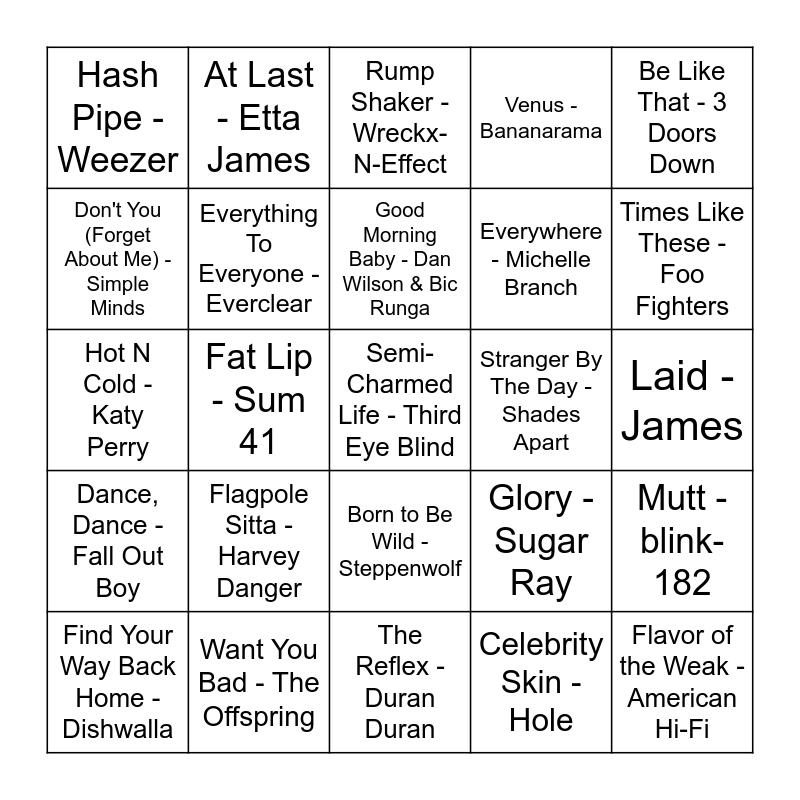 This bingo card has 53 words: One Week - Barenaked Ladies, Semi-Charmed Life - Third Eye Blind, I Walk Alone - Oleander, Celebrity Skin - Hole, Flagpole Sitta - Harvey Danger, Mrs. Robinson - Simon & Garfunkel, At Last - Etta James, How Sweet It Is (To Be Loved By You) - Marvin Gaye, Don't You (Forget About Me) - Simple Minds, Midnight at the Oasis - Maria Muldaur, Everything To Everyone - Everclear, You Wanted More - Tonic, Mutt - blink-182, Glory - Sugar Ray, Super Down - Super Transatlantic, Find Your Way Back Home - Dishwalla, Good Morning Baby - Dan Wilson & Bic Runga, Stranger By The Day - Shades Apart, Man With a Hex - The Atomic Fireballs, Be Like That - 3 Doors Down, Fat Lip - Sum 41, Flavor of the Weak - American Hi-Fi, Everywhere - Michelle Branch, Hash Pipe - Weezer, Smooth Criminal - Alien Ant Farm, Want You Bad - The Offspring, In Too Deep - Sum 41, The Last Time Again - Lit, Hit or Miss - New Found Glory, Times Like These - Foo Fighters, The Anthem - Good Charlotte, Swing, Swing - The All-American Rejects, Beat It - Michael Jackson, Maniac - Michael Sembello, Heaven Is a Place on Earth - Belinda Carlisle, Sweet Dreams (Are Made of This) - Eurythmics, Venus - Bananarama, The Reflex - Duran Duran, Rump Shaker - Wreckx-N-Effect, Wannabe - Spice Girls, I'll Make Love to You - Boyz II Men, This Is How We Do It - Montell Jordan, Laid - James, The Middle - Jimmy Eat World, Play That Funky Music - Wild Cherry, Born to Be Wild - Steppenwolf, Oh Yeah - Yello, Something in Your Mouth - Nickelback, Hot N Cold - Katy Perry, Dance, Dance - Fall Out Boy, My First Kiss - 3OH!3 ft. Ke$ha, Na Na Na - My Chemical Romance and Bump N' Grind - R. Kelly.