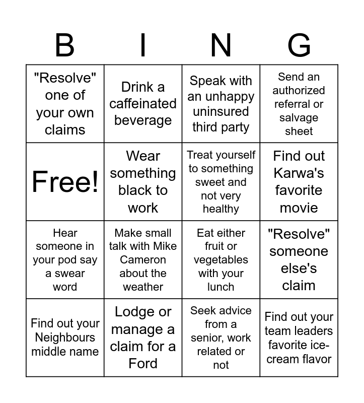This bingo card has 16 words: Lodge or manage a claim for a Ford, "Resolve" someone else's claim, Speak with an unhappy uninsured third party, "Resolve" one of your own claims, Hear someone in your pod say a swear word, Drink a caffeinated beverage, Eat either fruit or vegetables with your lunch, Seek advice from a senior, work related or not, Free!, Wear something black to work, Find out your Neighbours middle name, Send an authorized referral or salvage sheet, Make small talk with Mike Cameron about the weather, Find out Karwa's favorite movie, Treat yourself to something sweet and not very healthy and Find out your team leaders favorite ice-cream flavor.