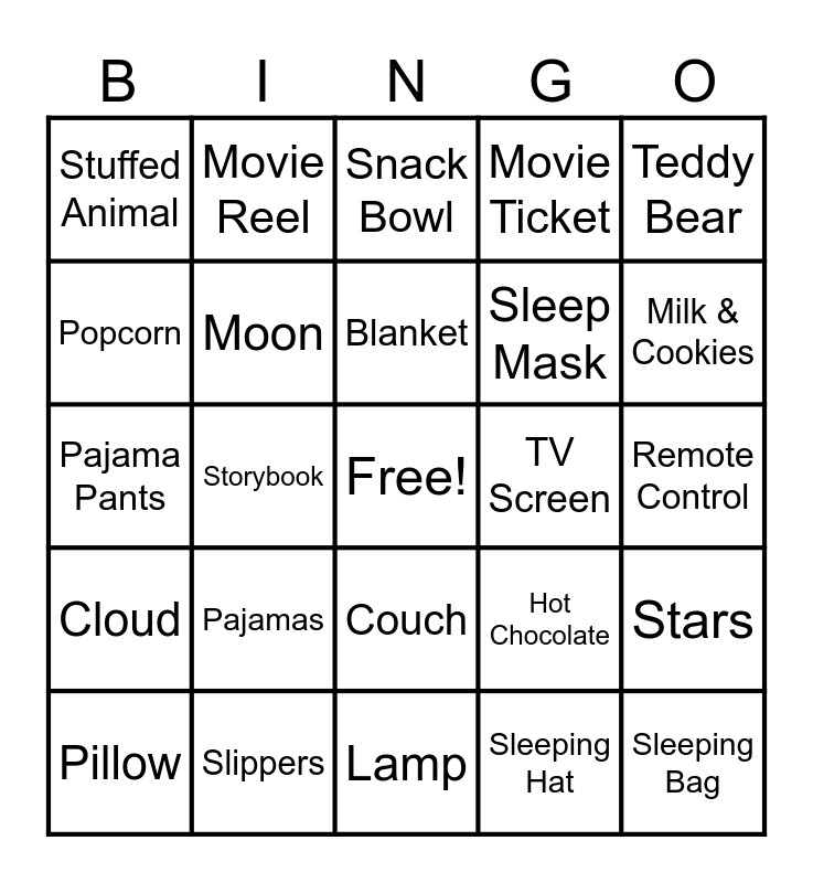 This bingo card has a free space and 24 words: Pajamas, Slippers, Blanket, Pillow, Teddy Bear, Stuffed Animal, Popcorn, Movie Reel, TV Screen, Couch, Sleep Mask, Pajama Pants, Hot Chocolate, Stars, Moon, Sleeping Hat, Remote Control, Snack Bowl, Milk & Cookies, Storybook, Sleeping Bag, Cloud, Movie Ticket and Lamp.