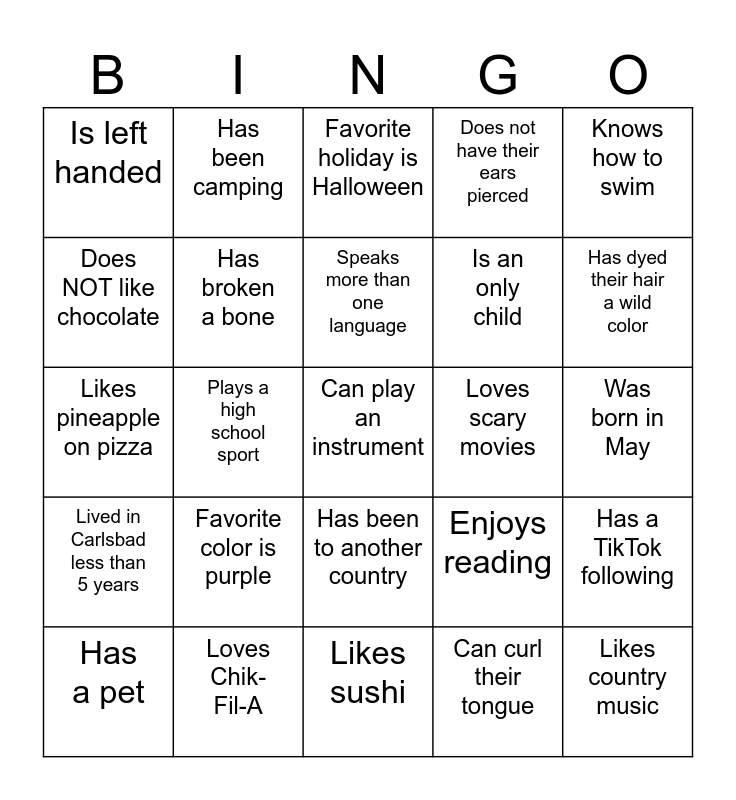 This bingo card has a free space and 24 words: Favorite color is purple, Loves Chik-Fil-A, Speaks more than one language, Has a pet, Knows how to swim, Is left handed, Does NOT like chocolate, Has been camping, Loves scary movies, Has been to another country, Is an only child, Likes pineapple on pizza, Enjoys reading, Has a TikTok following, Has broken a bone, Can curl their tongue, Was born in May, Favorite holiday is Halloween, Has dyed their hair a wild color, Plays a high school sport, Likes country music, Lived in Carlsbad less than 5 years, Does not have their ears pierced and Likes sushi.