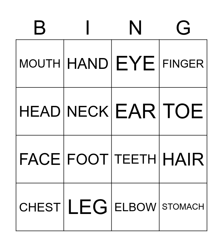 This bingo card has 20 words: HAIR, ARM, EYE, KNEE, CHEST, HEAD, LEG, MOUTH, FACE, HAND, FOOT, TEETH, NECK, STOMACH, EAR, NOSE, TOE, FINGER, ELBOW and SHOULDER.
