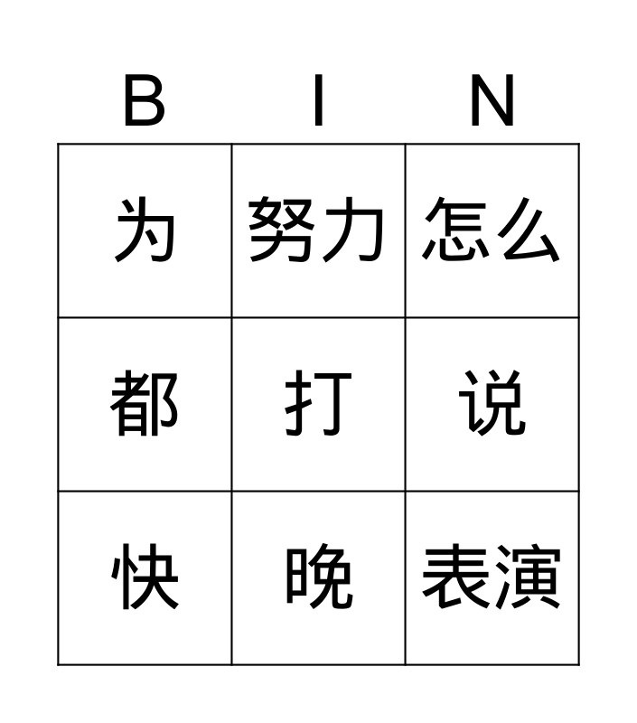 This bingo card has a free space and 8 words: 说, 怎么, 努力, 快, 为, 表演, 都 and 晚.