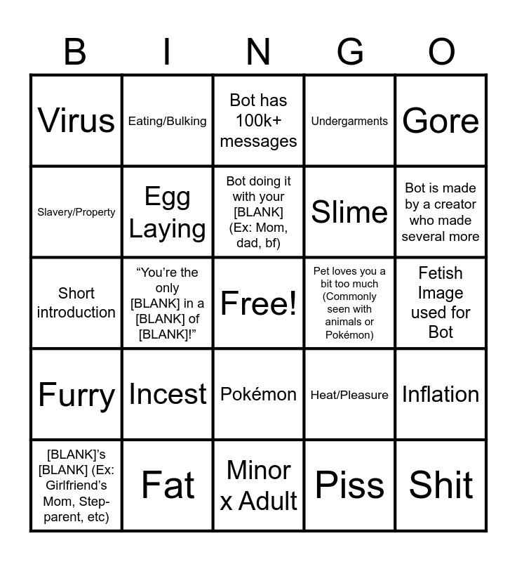 This bingo card has a free space and 46 words: Vore, Shit, Fart/Gassy, Minor x Adult, Incest, MPreg, Eating/Bulking, BDSM, Slavery/Property, Feet, Egg Laying, Undergarments, Inflation, Heat/Pleasure, Amputee, No consent, Bot doing it with your [BLANK] (Ex: Mom, dad, bf), Pet loves you a bit too much (Commonly seen with animals or Pokémon), Humiliation, Gore, “You’re the only [BLANK] in a [BLANK] of [BLANK]!”, Piss, Virus, Slime, Egg Insertion, Bot is made by a creator who made several more, [BLANK]’s [BLANK] (Ex: Girlfriend’s Mom, Step-parent, etc), Bullying/Victimizing, Pokémon, Furry, Popular Fictional Character, Real Person, Diapers, Transformation or Transfurmation, Baby-related, Fat, Fetish Image used for Bot, School, Age regression, Long introduction, Poorly made introduction, Bot has 100k+ messages, Short introduction, Roblox, Obviously made by a kid and Kidnapping.