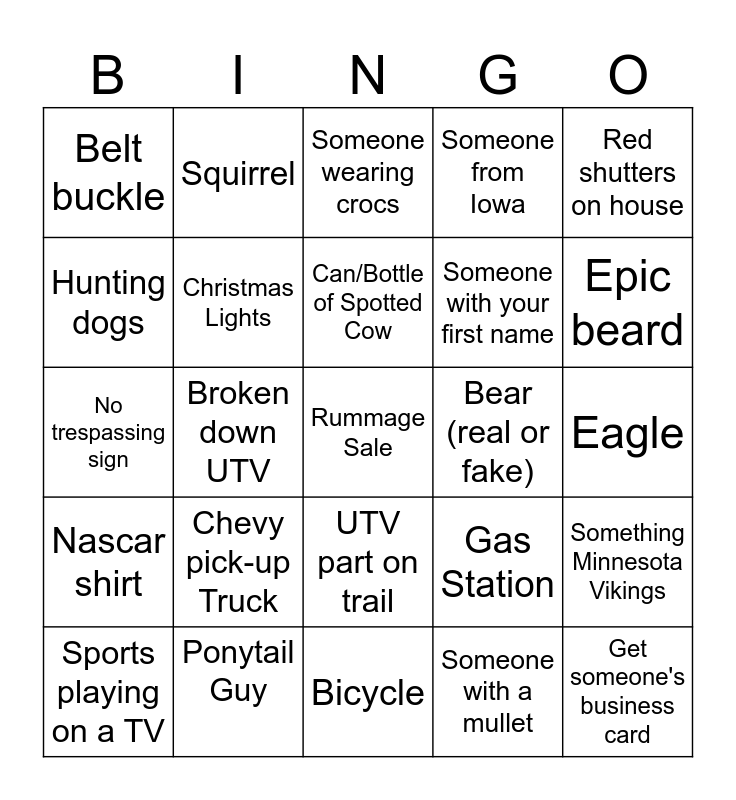 This bingo card has 30 words: Ponytail Guy, Joe Biden Sign, Broken down UTV, Pabst Beer sign, Belt buckle, Someone wearing crocs, Christmas Lights, UTV part on trail, Bear (real or fake), Bicycle, Eagle, Rummage Sale, Someone with a mullet, Get someone's business card, Epic beard, Rubber Duck, Gas Station, Nascar shirt, Chevy pick-up Truck, Red shutters on house, No trespassing sign, Animal head on wall, Squirrel, Someone with your first name, Hunting dogs, Someone from Iowa, Something Minnesota Vikings, Sports playing on a TV, Can/Bottle of Spotted Cow and Canoe/Kayak.