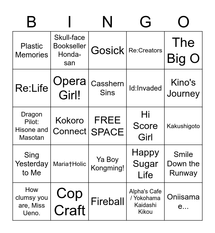 This bingo card has a free space and 24 words: Maria†Holic, Cop Craft, Casshern Sins, How clumsy you are, Miss Ueno., The Big O, Plastic Memories, Re:Life, Skull-face Bookseller Honda-san, Hi Score Girl, Ya Boy Kongming!, Id:Invaded, Dragon Pilot: Hisone and Masotan, Happy Sugar Life, Smile Down the Runway, Opera Girl!, Alpha's Cafe / Yokohama Kaidashi Kikou, Kakushigoto, Gosick, Kino's Journey, Kokoro Connect, Oniisama e..., Sing Yesterday to Me, Re:Creators and Fireball.