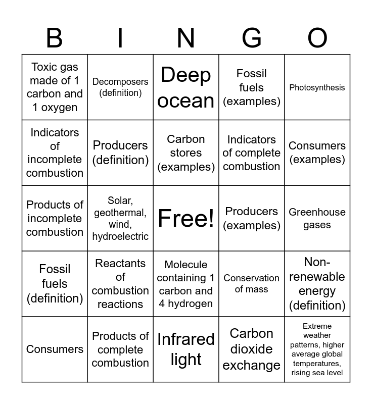 This bingo card has a free space and 34 words: Respiration, Carbon dioxide exchange, Combustion, Decomposition/decay, Fossil fuels (definition), Producers (definition), Photosynthesis, Consumers, Decomposers (definition), Carbon stores (definition), Carbon stores (examples), Deep ocean, Sinking sediment, Decomposers (examples), Producers (examples), Consumers (examples), Products of complete combustion, Products of incomplete combustion, Reactants of combustion reactions, Conservation of mass, Molecule containing 1 carbon and 4 hydrogen, Molecule containing 1 carbon and 2 oxygen, Toxic gas made of 1 carbon and 1 oxygen, Greenhouse gases, Infrared light, Extreme weather patterns, higher average global temperatures, rising sea level, Fossil fuels (examples), Burning fossil fuels, keeping livestock (cows, sheep), deforestation, Indicators of complete combustion, Indicators of incomplete combustion, Renewable energy (definition), Solar, geothermal, wind, hydroelectric, Non-renewable energy (definition) and Fossil fuels are an example of this.