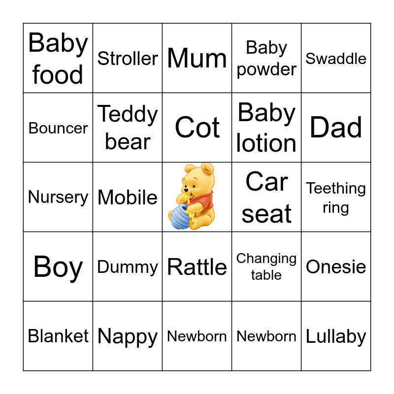 This bingo card has a free space and 24 words: Dummy, Nappy, Cot, Blanket, Swaddle, Baby food, Bouncer, Stroller, Car seat, Rattle, Baby lotion, Nursery, Changing table, Onesie, Teddy bear, Newborn, Teething ring, Mum, Dad, Mobile, Lullaby, Boy, Baby powder and Newborn.