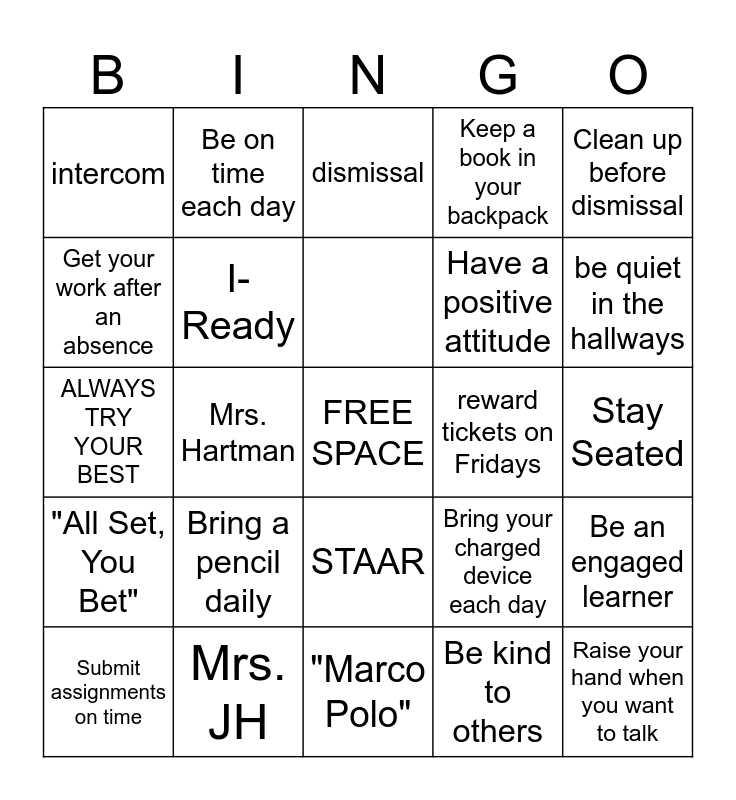This bingo card has a free space and 29 words: Mrs. JH, Mrs. Johnson-Hartman, Mrs. Hartman, Mrs. Johnson, intercom, dismissal, I-Ready, STAAR, reward tickets on Fridays, "Marco Polo", Stay Seated, Raise your hand when you want to talk, Be kind to others, NO CELL PHONES, be quiet in the hallways, Use restroom before class, Bring your charged device each day, "All Set, You Bet", Bring a pencil daily, Clean up before dismissal, ALWAYS TRY YOUR BEST, Do not go & open the door, Be on time each day, Have a positive attitude, Get your work after an absence, Keep a book in your backpack, Be an engaged learner, Submit assignments on time and Reward Fridays can be omitted.