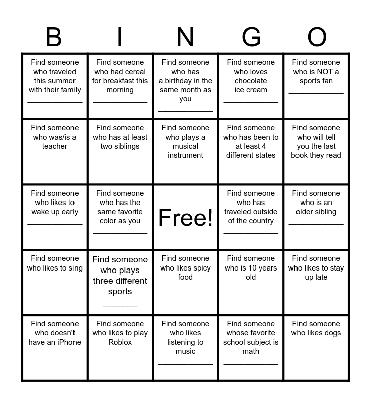 This bingo card has a free space and 29 words: Find someone who doesn't have an iPhone _____________, Find someone who is left handed _____________, Find someone who has the same favorite color as you _____________, Find someone who speaks more than 1 language _____________, Find someone who traveled this summer with their family _____________, Find someone who has a birthday in the same month as you _____________, Find someone who has at least two siblings _____________, Find someone who plays three different sports _______, Find someone who has traveled outside of the country _____________, Find someone who likes to play Roblox _____________, Find someone who is an older sibling _____________, Find someone who likes dogs _____________, Find someone who likes listening to music _____________, Find someone whose favorite school subject is math _____________, Find someone who will tell you the last book they read _____________, Find someone who likes to create art _____________, Find someone who likes spicy food _____________, Find someone who likes to sing _____________, Find someone who is NOT a sports fan _____________, Find someone who likes to wake up early _____________, Find someone who is 10 years old _____________, Find someone who was not born in Hawaii _____________, Find someone who has been to at least 4 different states _____________, Find someone who was/is a teacher _____________, Find someone who loves chocolate ice cream _____________, Find someone who had cereal for breakfast this morning _____________, Find someone who likes to stay up late _____________, Find someone who plays a musical instrument _____________ and Find someone who is a godparent _____________.
