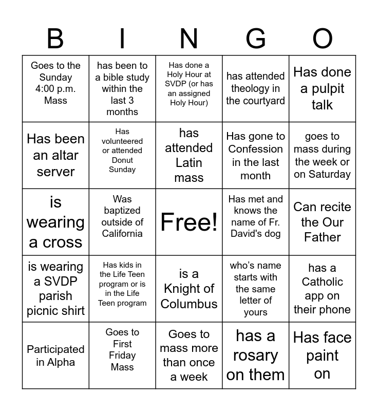 This bingo card has a free space and 29 words: Participated in Alpha, Met their spouse or best friend at church, Was baptized outside of California, Has the same birth month as you, Goes to the Sunday 4:00 p.m. Mass, Has done a Holy Hour at SVDP (or has an assigned Holy Hour), Has volunteered or attended Donut Sunday, Has kids in the Life Teen program or is in the Life Teen program, Has met and knows the name of Fr. David's dog, Goes to First Friday Mass, Can recite the Our Father, Has face paint on, Goes to mass more than once a week, has a rosary on them, goes to mass during the week or on Saturday, Made their First Communion or received another sacrament at SVDP, is a Knight of Columbus, is wearing a SVDP parish picnic shirt, Has done a pulpit talk, is wearing a cross, who’s name starts with the same letter of yours, has a prayer or saint card on them, Has gone to Confession in the last month, Has been an altar server, has attended theology in the courtyard, has been to a bible study within the last 3 months, has a Catholic app on their phone, has attended Latin mass and can recite the hail Mary.