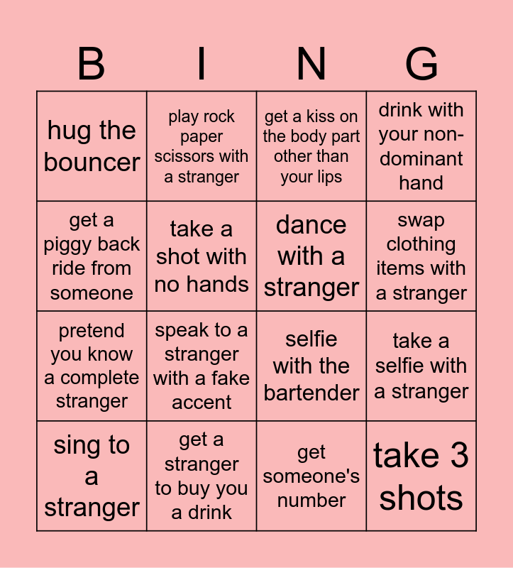 This bingo card has 16 words: get a stranger to buy you a drink, take a selfie with a stranger, get a kiss on the body part other than your lips, hug the bouncer, pretend you know a complete stranger, play rock paper scissors with a stranger, selfie with the bartender, get someone's number, get a piggy back ride from someone, take a shot with no hands, sing to a stranger, drink with your non-dominant hand, speak to a stranger with a fake accent, swap clothing items with a stranger, dance with a stranger and take 3 shots.