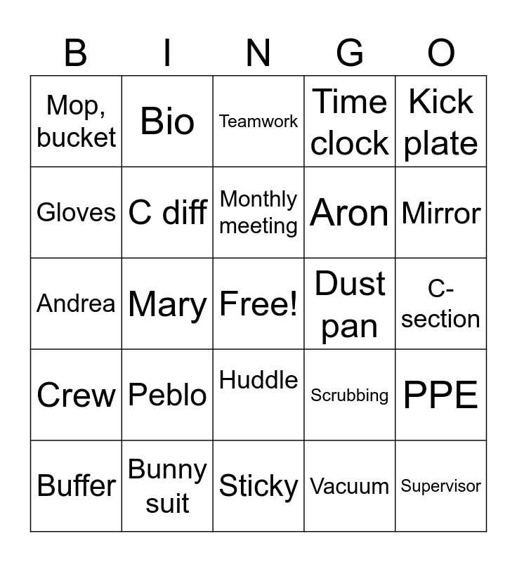 This bingo card has a free space and 47 words: Cleaning cart, Supervisor, Detailing, Sticky, Peblo, Virex, Bio, Low dusting, Gloves, Gigs, C diff, Time clock, PPE, Scrubbing, Keys, Code blue, Monthly meeting, Dust pan, Floor tech, Kick plate, Mary, Vacuum, Mop, bucket, Aron, Duster, Mirror, Buffer, Kill time, Huddle, Crew, Door frame, X-ray, Core values, Terminal, Clinic, Bunny suit, C-section, Blue rags, Blue mops, Trackers, High dusting, Teamwork, Andrea, PTOT, Work order, Chain of command and J-fill.