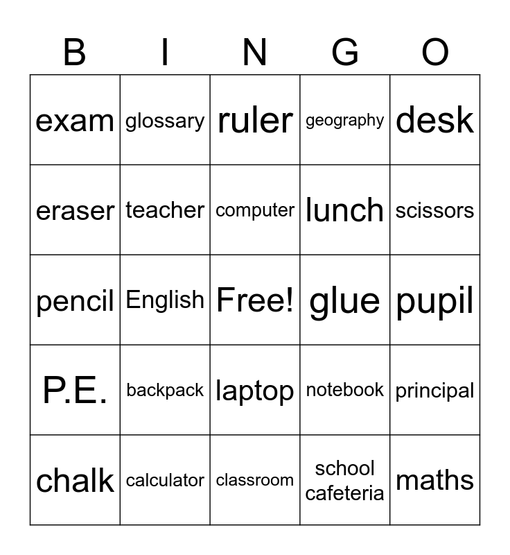 This bingo card has a free space and 24 words: backpack, calculator, computer, chalk, desk, exam, eraser, glossary, glue, laptop, lunch, pencil, notebook, principal, teacher, school cafeteria, pupil, ruler, scissors, English, maths, P.E., geography and classroom.