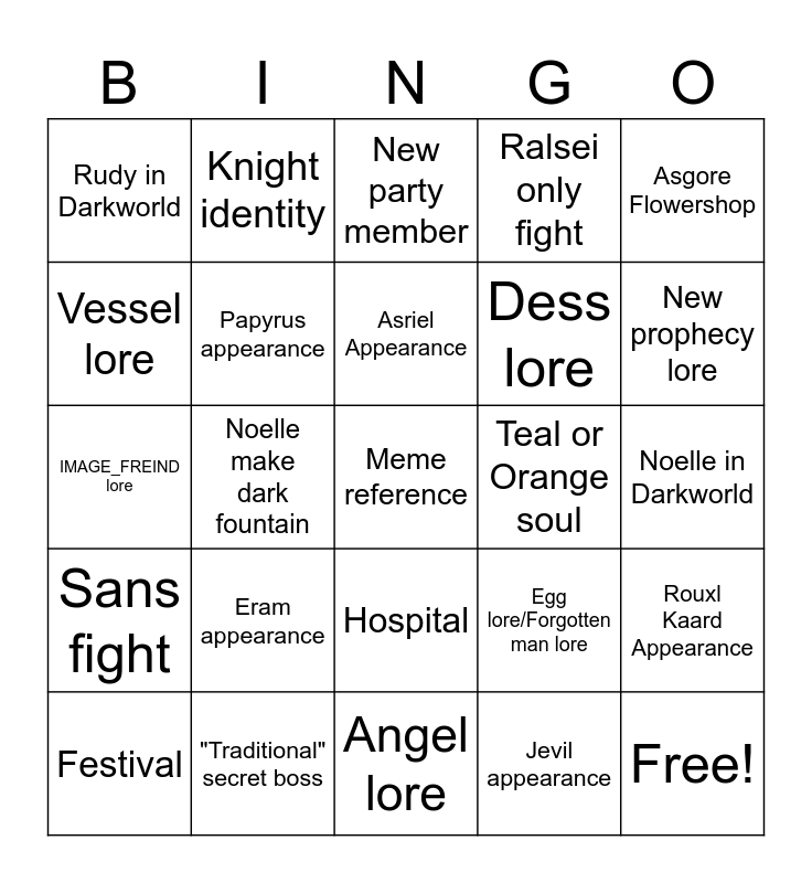 This bingo card has 34 words: Free!, Jevil appearance, Spamton appearance, Blue soul, Sans fight, Papyrus appearance, Asgore Flowershop, Festival, Knight identity, Friend inside me, Asriel Appearance, New party member, W.D Gaster new diaglouge, Asgore fight, Teal or Orange soul, New prophecy lore, "Traditional" secret boss, IMAGE_FREIND lore, Eram appearance, Egg lore/Forgotten man lore, Hospital, Bunker, Rudy in Darkworld, Noelle in Darkworld, Angel lore, Meme reference, Ralsei only fight, Darker world, Dess lore, Vessel lore, New bunker code, Noelle make dark fountain, Rouxl Kaard Appearance and Lancer Appearance.