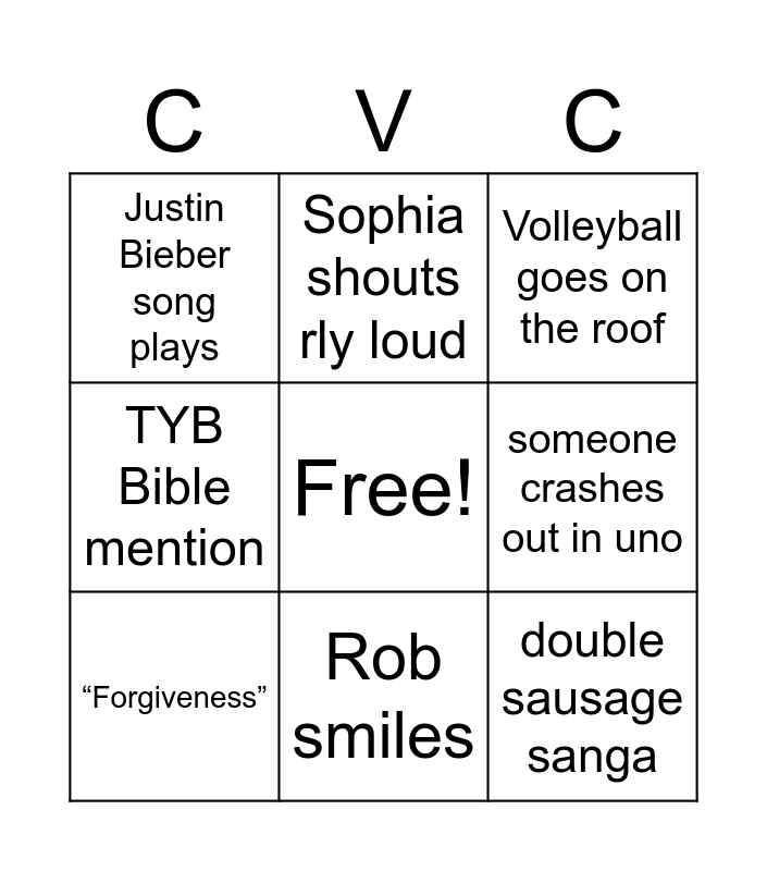 This bingo card has a free space and 12 words: Ps Jesse mentions Avery, Some one says “amen”, double sausage sanga, someone crashes out in uno, Sophia shouts rly loud, Volleyball goes on the roof, Rob smiles, SNR boys lose, Justin Bieber song plays, TYB Bible mention, “Forgiveness” and Michelle loses her keys.