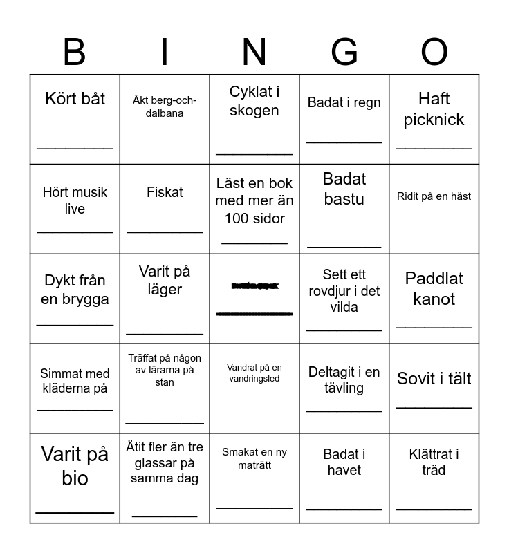 This bingo card has a free space and 24 words: Träffat på någon av lärarna på stan ______________, Ätit fler än tre glassar på samma dag _________, Läst en bok med mer än 100 sidor ________, Varit på bio _______, Haft picknick ________, Kört båt ________, Hört musik live __________, Åkt berg-och-dalbana _____________, Sett ett rovdjur i det vilda __________, Vandrat på en vandringsled _______________, Badat bastu ________, Dykt från en brygga _________, Deltagit i en tävling __________, Sovit i tält ________, Fiskat __________, Badat i havet __________, Paddlat kanot ________, Cyklat i skogen _________, Ridit på en häst _____________, Varit på läger _________, Klättrat i träd __________, Simmat med kläderna på ___________, Badat i regn __________ and Smakat en ny maträtt _____________.
