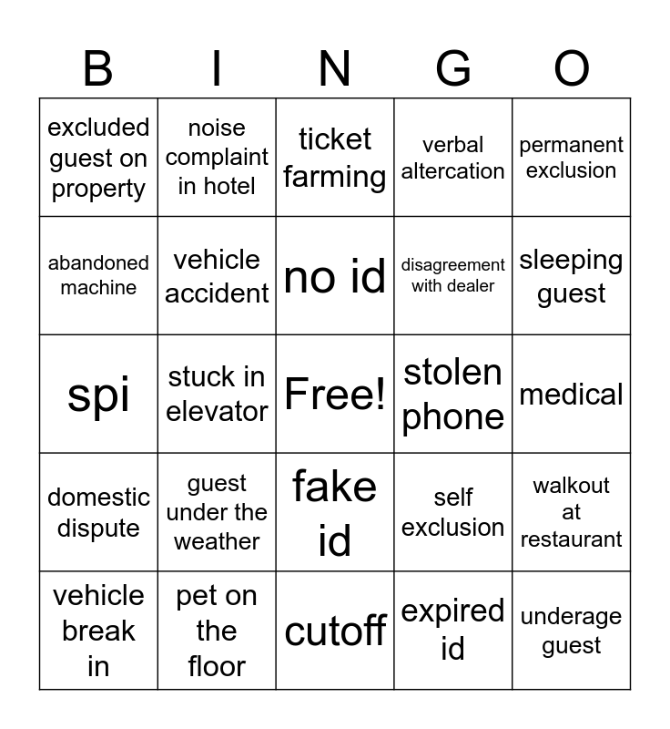 This bingo card has a free space and 24 words: guest under the weather, pet on the floor, no id, vehicle break in, permanent exclusion, excluded guest on property, abandoned machine, noise complaint in hotel, stolen phone, fake id, disagreement with dealer, spi, self exclusion, walkout at restaurant, vehicle accident, expired id, medical, ticket farming, sleeping guest, stuck in elevator, underage guest, domestic dispute, verbal altercation and cutoff.
